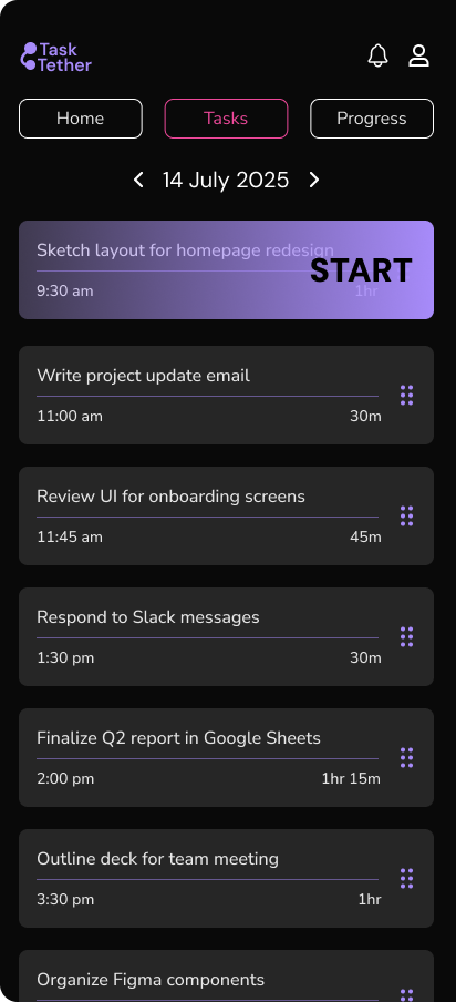 The goal is to spend less time managing productivity and more time actually getting things done. Task Tether transforms task management into a clear and motivating flow that helps users stay focused and finish strong.